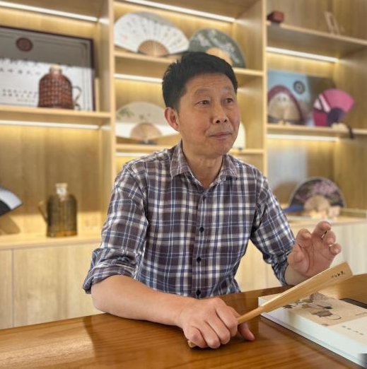 国家级非遗项目——王氏制扇技艺第五代传承人王宏彬正在介绍竹扇。(图/中新网)