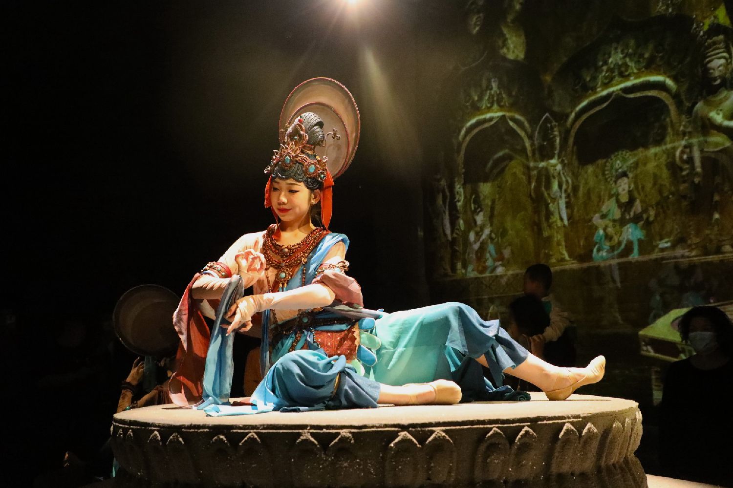 北京时间6月3日晚,在甘肃省酒泉市敦煌市乐动敦煌剧场,大型洞窟式沉浸体验剧《乐动敦煌》的演员在演出。(图/新华社)