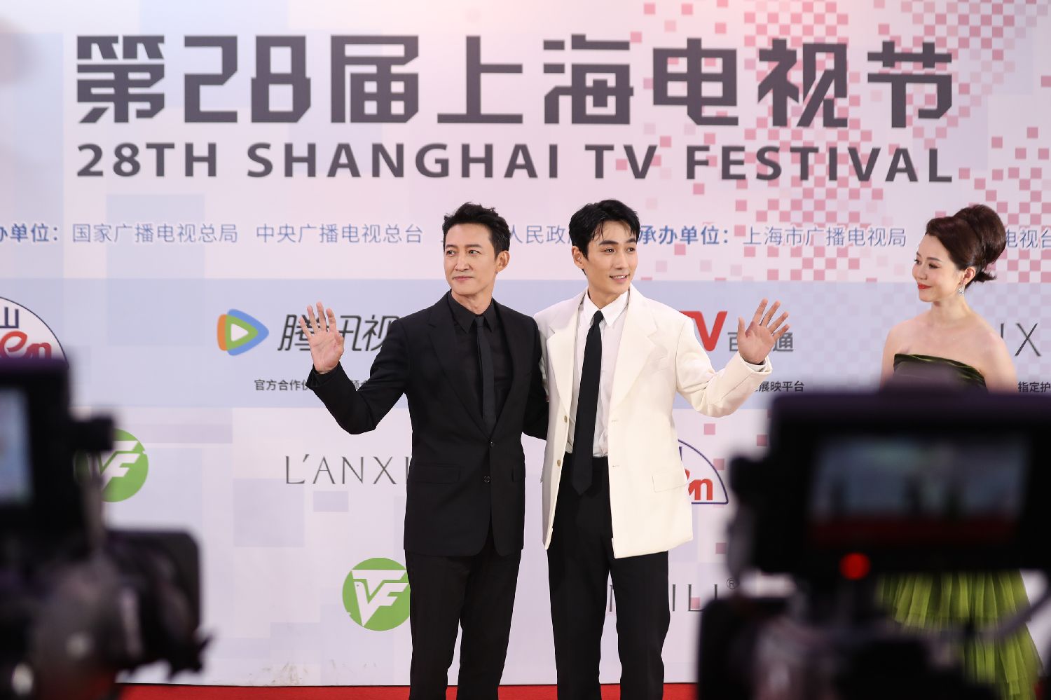 北京时间23日晚,第28届上海电视节“白玉兰绽放”颁奖典礼红毯仪式在上海举行。图为朱一龙(右)、王阳(左)亮相红毯。(图/中新社)