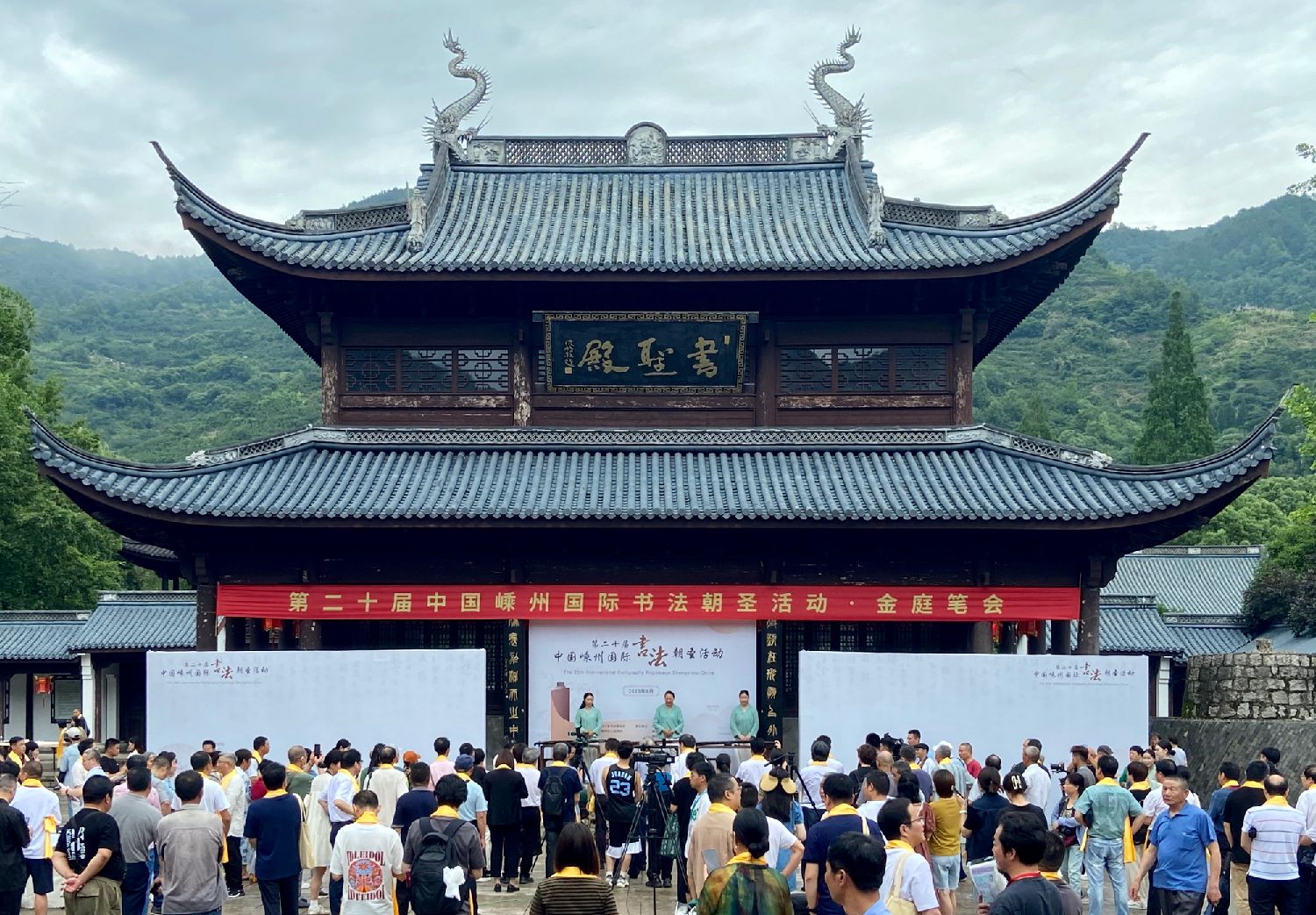 在“金庭笔会”环节,数十名书法爱好者现场泼墨,浙江省书法家协会主席赵雁君开笔写下“问道金庭,赓续兰亭”八个大字。