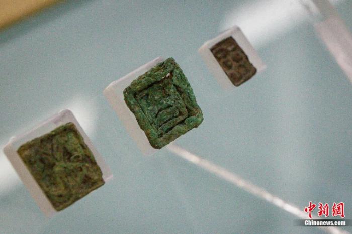 河南省安阳博物馆展出的商代青铜短印章,这是中国发现最早的青铜玺印实物。(图/中新社)