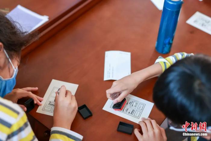 北京市西城区黄城根小学的小学生们参加定制款印章盖章挑战。(图/中新社)