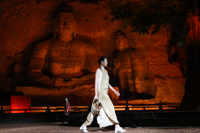“时装走秀最大的魅力,在于他的‘不语’。这样的艺术表现形式,放在云冈石窟前尤为合适。因此,当一场云冈石窟前的历史人文表达,浓缩在一件件或沉甸或飘逸的服饰中,并在这个场域里逆时针地流转起来,能够非常好地契合‘对话’的创作意图。”本次实景秀表演部分的导演赵以说。