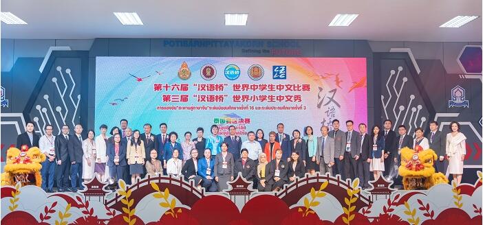第十六届“汉语桥”世界中学生中文比赛、第三届“汉语桥”世界小学生中文秀泰国赛区决赛嘉宾合影。(图/人民网)
