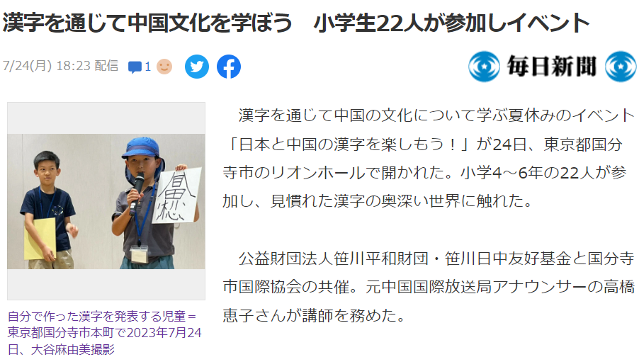 “欣赏日本和中国的汉字!”暑期活动7月24日在东京都国分寺市举行。22名4到6年级的小学生参加了此次活动,共同领略日常被人所熟知的汉字的深奥世界,并通过汉字了解和学习中国文化。