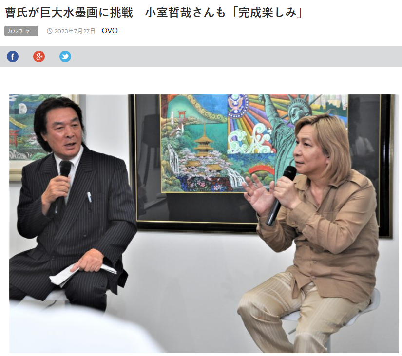 今年62岁的出身中国吉林省的水墨画家曹亚钢以融合日本绘画技法的独特画风而闻名,他目前正在长崎县西海市的工作室中创作其职业生涯中最大的一幅水墨画。日前,在东京举行的作品制作记者见面会上,日本音乐家小室哲哉到场表示支持和鼓励,他表示非常期待作品的完成,并为曹亚钢突破自我、挑战巨幅水墨画送上了应援。