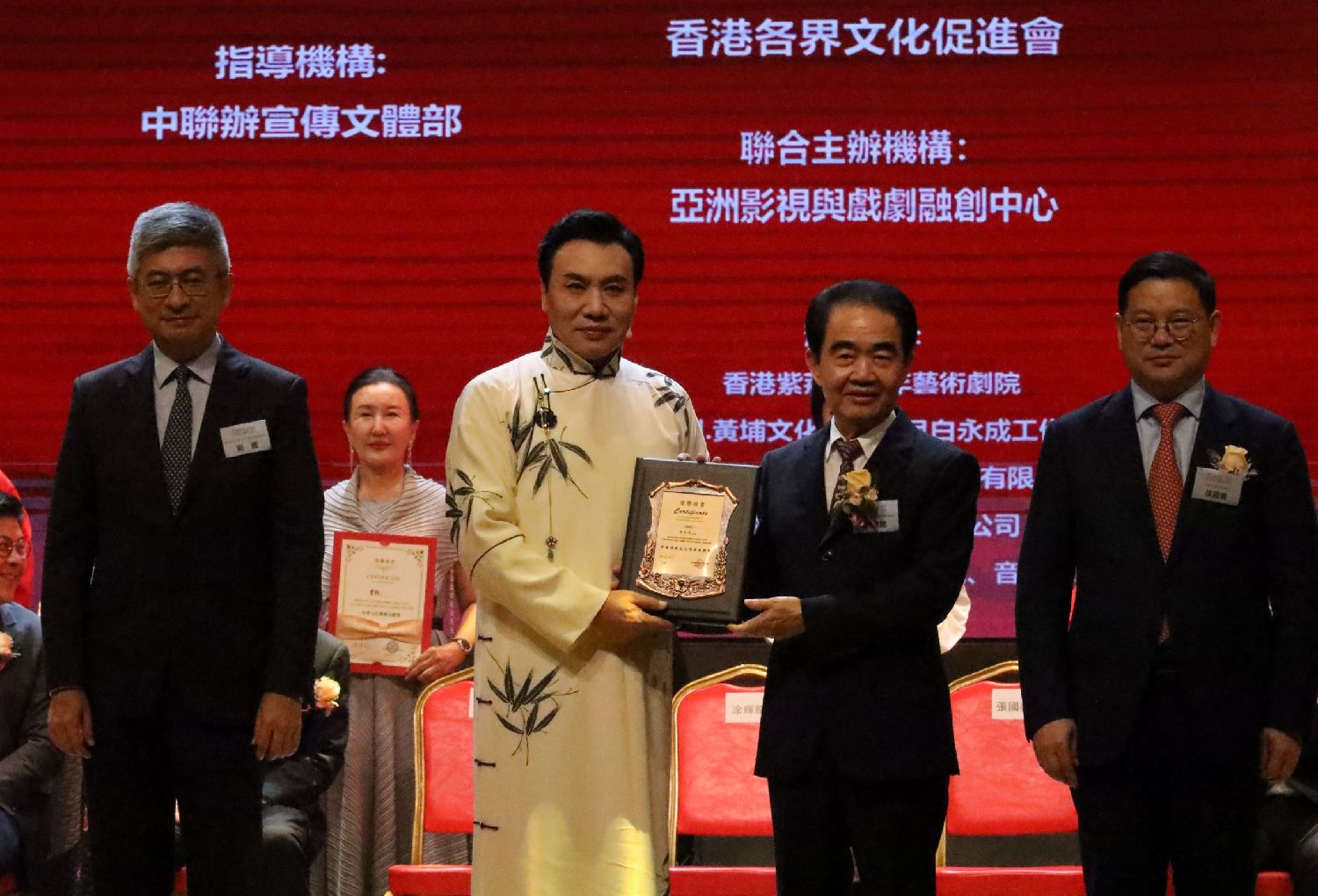 仪式上,主礼嘉宾为白永成颁发“中华传统文化传承成就奖”,8位演员代表荣获“中华文化传播贡献奖”。