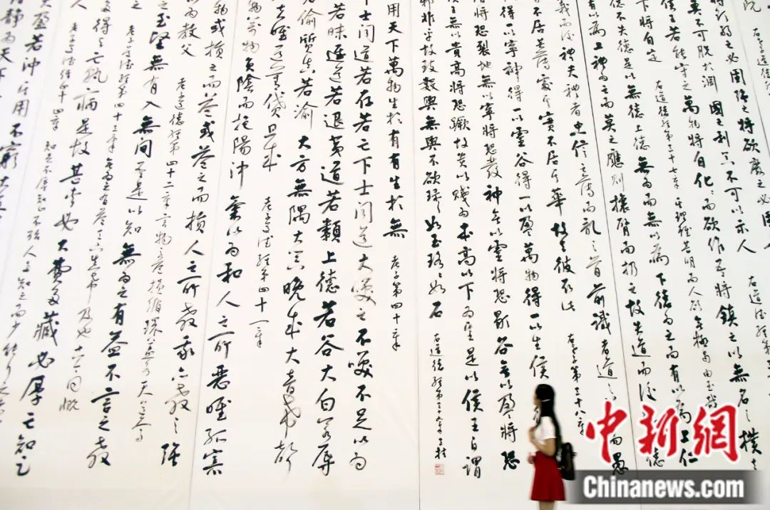 一位参观者在欣赏巨大幅书法作品《道德经》全卷。(图/中新网)