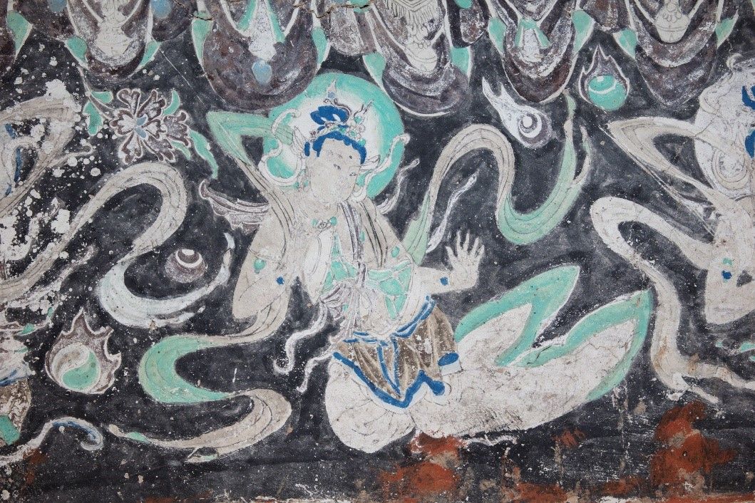 图为展览中呈现的敦煌榆林窟中的飞天乐伎。(图/中新社)