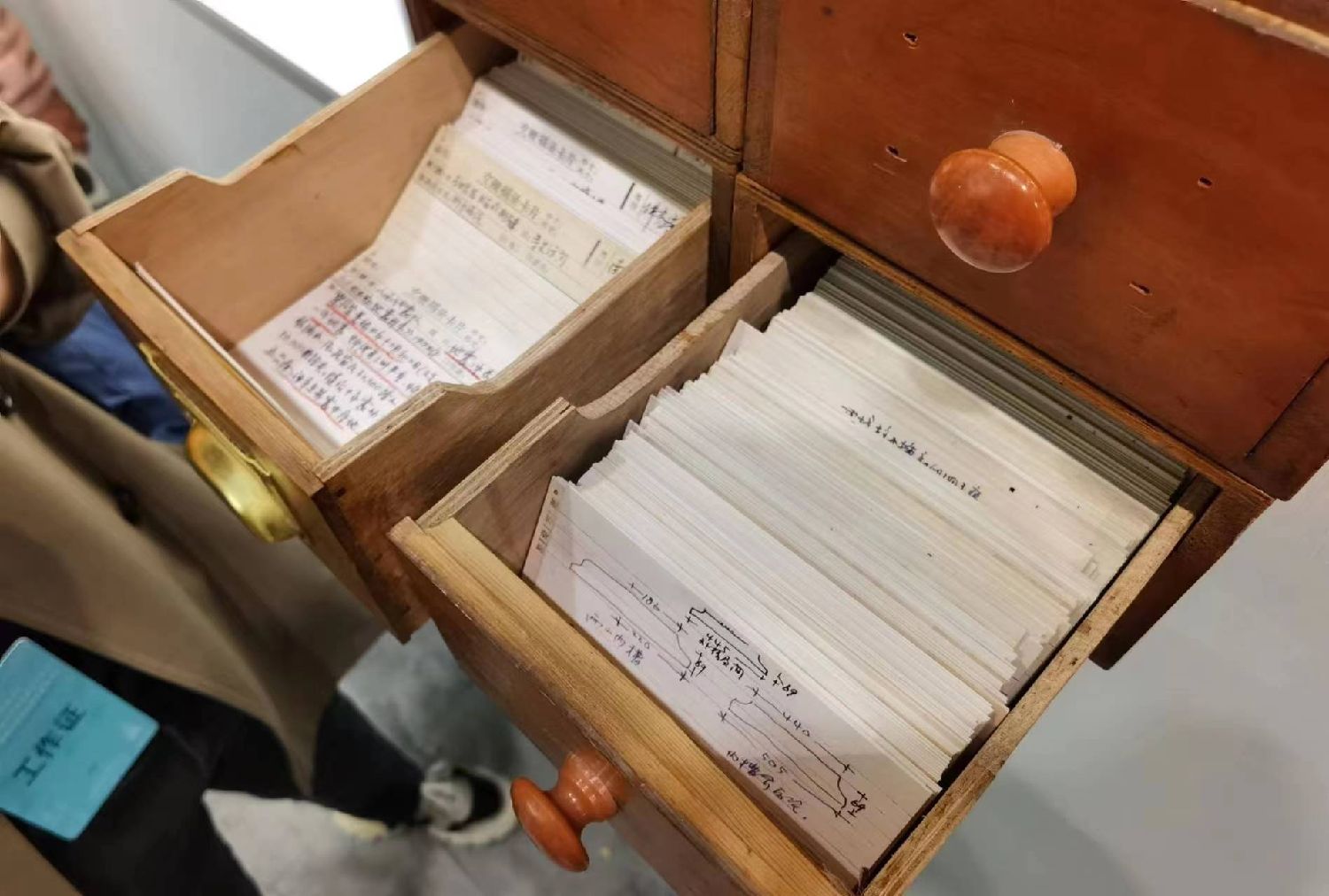 展厅内还复原了柴泽俊生前的“卡片抽屉”。用随身携带的卡片来记录重要信息是柴泽俊先生一生的工作习惯,不论走到哪里调研考察,卡片永不离身。在柴泽俊生前写字台座椅的后方,像一面药房的中药抽屉墙,摆放着各种按照建筑分类的卡片,记录着古建筑的重要信息。