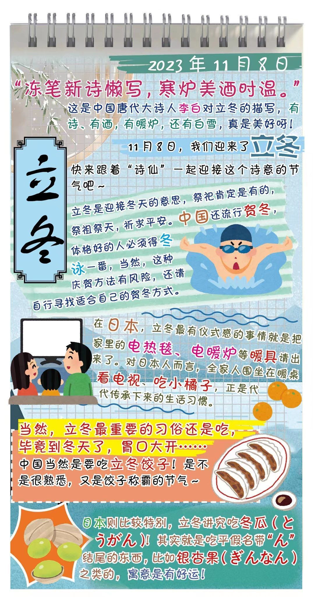 “冻笔新诗懒写,寒炉美酒时温。”这是中国唐代大诗人李白对立冬的描写,有诗、有酒,有暖炉,还有白雪,真是美好呀!11月8日,我们迎来了立冬,快来跟着“诗仙”一起迎接这个诗意的节气吧~