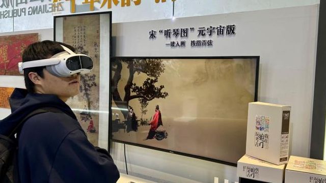 与之紧邻的浙江展区,宋代名画《听琴图》也有了元宇宙版,观众戴上VR眼镜即可“入画”,以第三人称或画中人物的视角,深度感知松下抚琴赏曲的意境。现场工作人员周杰表示,数字扫描、建模修复等技术让古画得以活态化传承,“由于年代久远,有些古画可能会颜色较暗、模糊不清,我们以顺应当下社会潮流的方式,还原出了古画本来的样子,观众也能更好地去理解古画。”