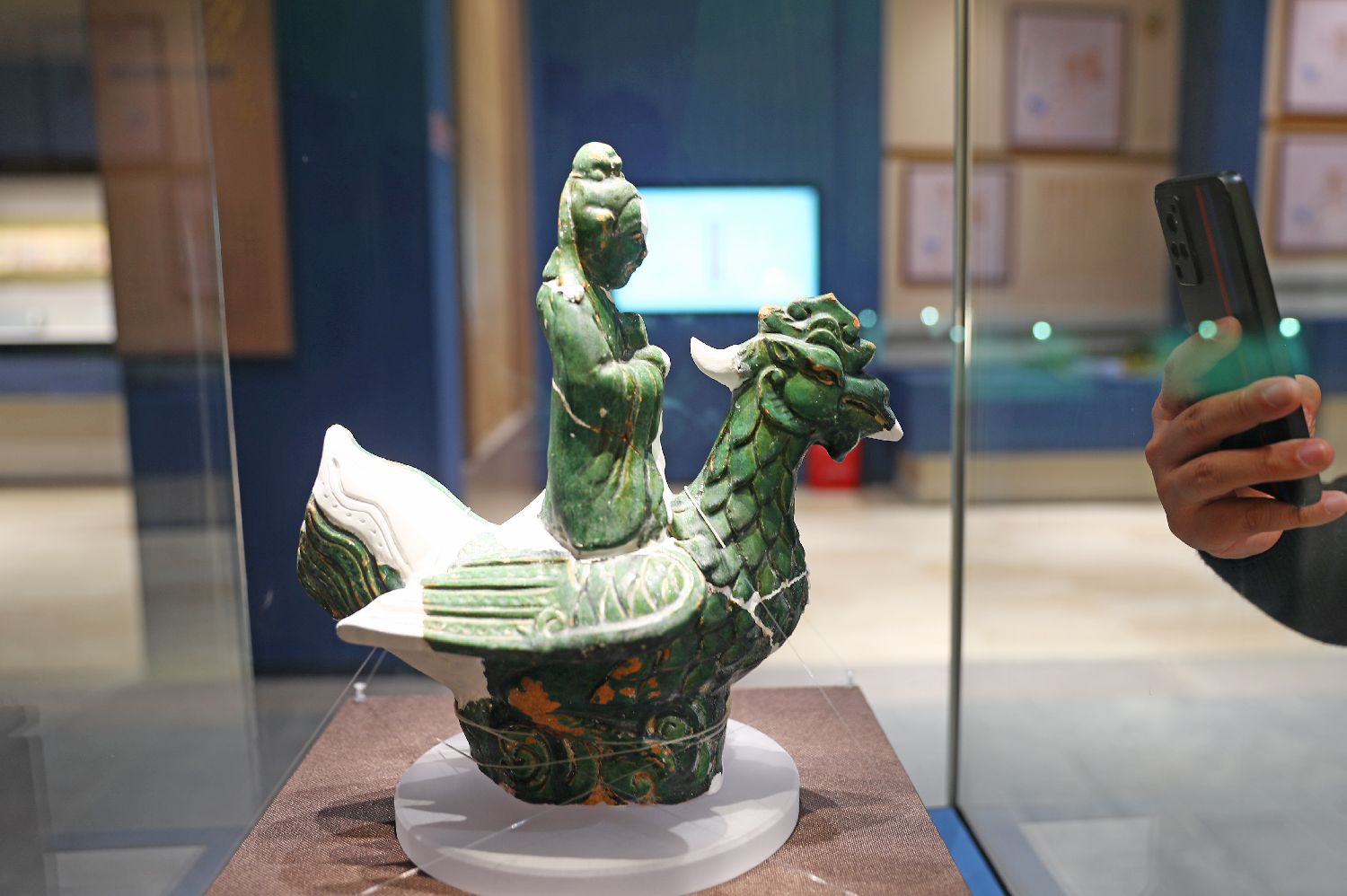 19日,游客用手机拍摄江西龙虎山大上清宫遗址出土的文物《绿釉骑凤仙人》。(图/中新社)