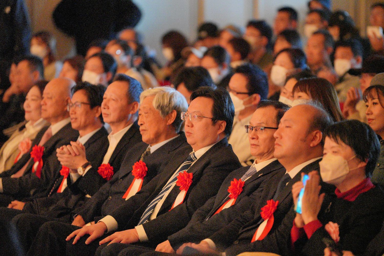 昨日到场的嘉宾还有:中华人民共和国驻日本国大使馆一等书记官兼领事王宝锋先生,日本华文教育基金会林立理事长,NPO法人同源中文学校杨林校长,全日本华侨华人社团联合会副理事长、常务副会长、日本华文教育基金会理事长高原龙一先生,全日本华侨华人社团联合会常务副会长、华文教育委员会副委员长、暨南大学日本学院日方代表、千代田教育集团会长栗田秀子女士,中文导报社杨文凯社长,全日本华侨华人社团联合会副会长、日本天津总商会会长孟庆祥先生,以及日本华文教育协会理事王婕女士、日本华文教育协会事务局长福安丽子女士、中国太平洋保险公司日本公司董事副总经理谢丹女士、日本华世艺术学校邵晓楠校长和株式会社SNSソフト孙前进社长。中国银联日本创始人、睦新中文学校监事韦晓寅先生和株式会社パイプエンジニアリング张百庆社长,作为睦新毕业生家长代表也在嘉宾席就座。