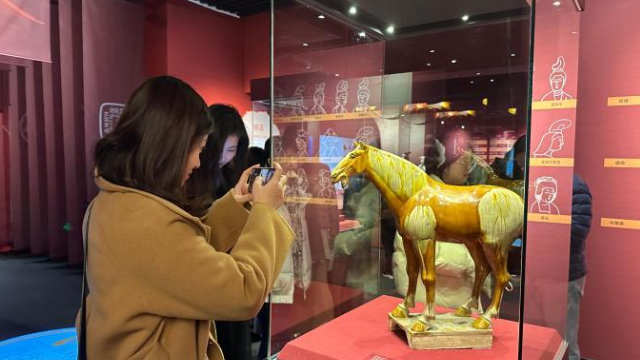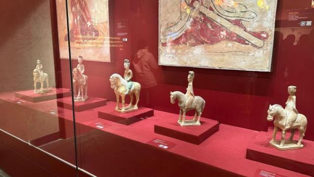 唐墓中的壁画和彩色陶俑是唐代极具代表性的艺术珍品。在展厅内,女性陶俑类型多样,各种女坐俑、立俑、侍俑、乐舞俑、骑马俑、贵妇俑……这些女俑造型生动,尤其是三彩女俑,釉色艳丽,呈现了唐代女性“千人千面”的生存状态。