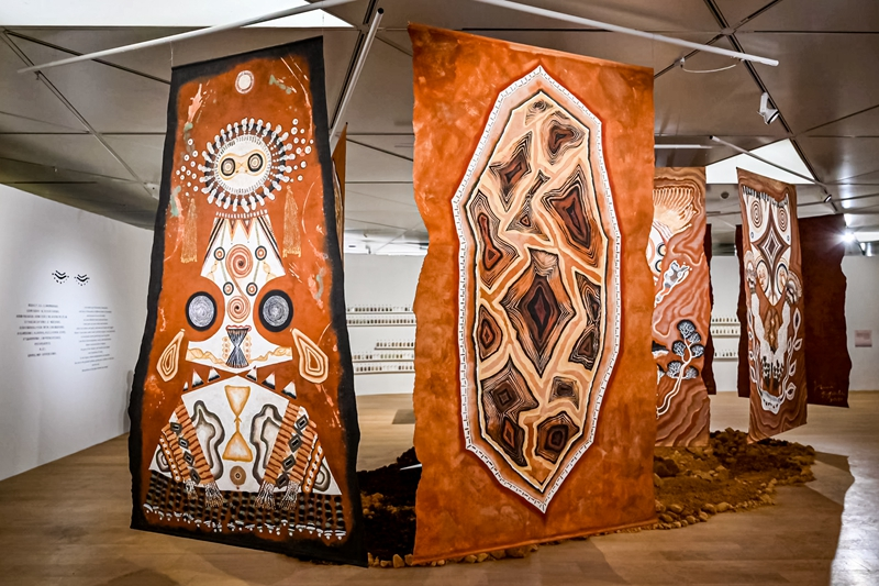 用生土为主制成的混合材料画的《远古“织梦人”》系列绘画作品。(图/上海第一财经)