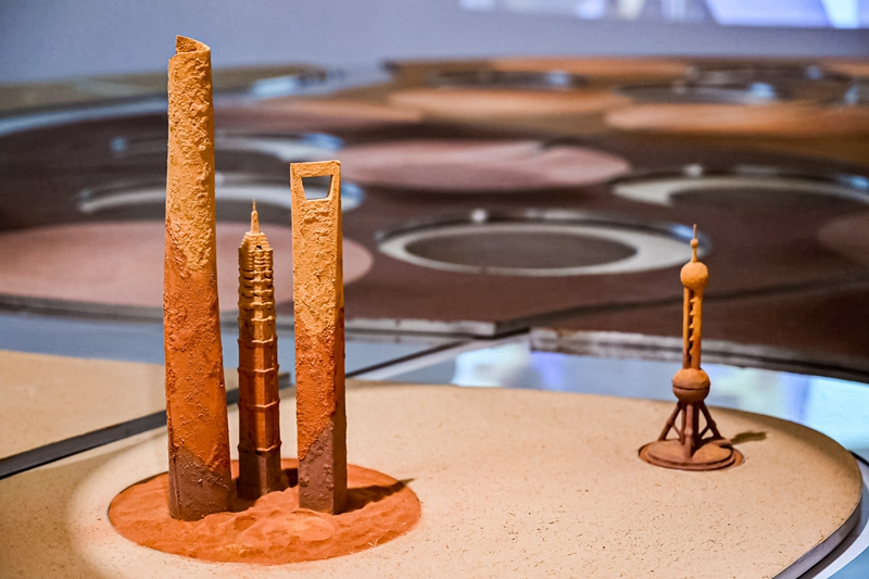 《心之所向的“土”的风景》,在大型沙盘上的土制上海地标建筑模型。(图/上海第一财经)
