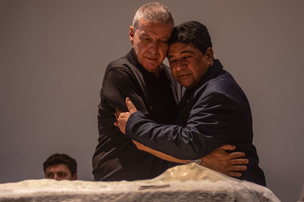 当地时间2024年1月7日,巴西里约热内卢,巴西里约热内卢,巴西足协主席埃德纳尔多·罗德里格斯(右)与巴西足球传奇人物马里奥·扎加洛的儿子马里奥·塞萨尔·扎加洛拥抱,悼念逝者宽慰其家人。(图源视觉中国)