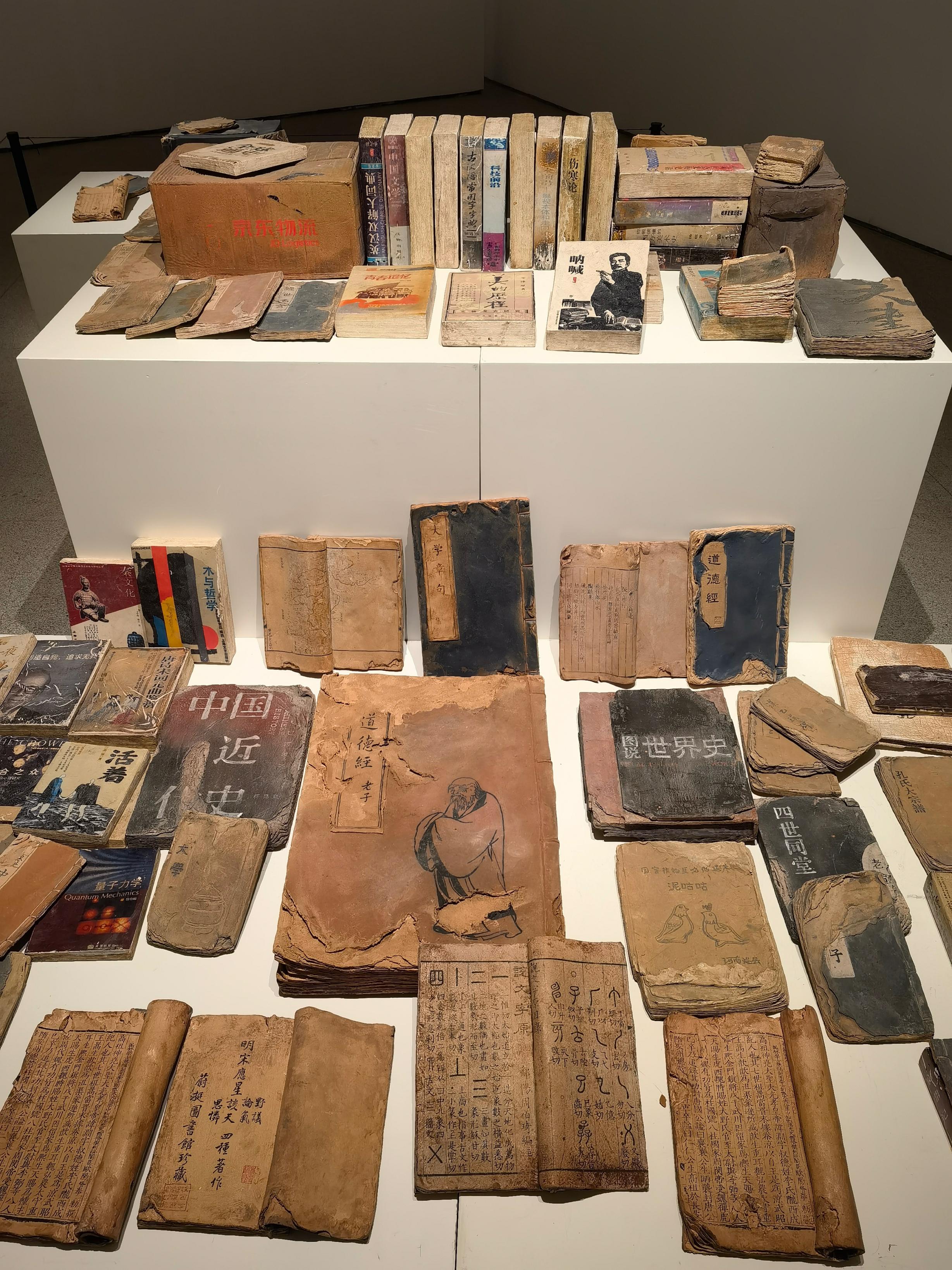 “哇,这些竟然是陶瓷作品!”展厅内,一堆“旧书”摆放在展台上,包括《道德经》《中国近代史》《呐喊》等经典名著,卷曲的书页、泛黄的封面,让人难辨作品的真实材质。这是艺术家钞子艺、钞子伟的作品《史迹》。艺术家郑清海的作品《千手》在两米长的尺寸内,塑造了如浪涛般层层叠叠的“千手”,引来观众啧啧称奇。