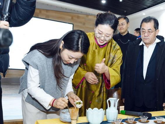 注水、击浮、捣碎、筛茶、调膏、加水、点茶……在非遗展示环节,韩国籍外教吴俊馨跟茶艺师学习点茶技艺,她还在茶汤上写下“中国”二字,表达对中国传统文化的喜爱。