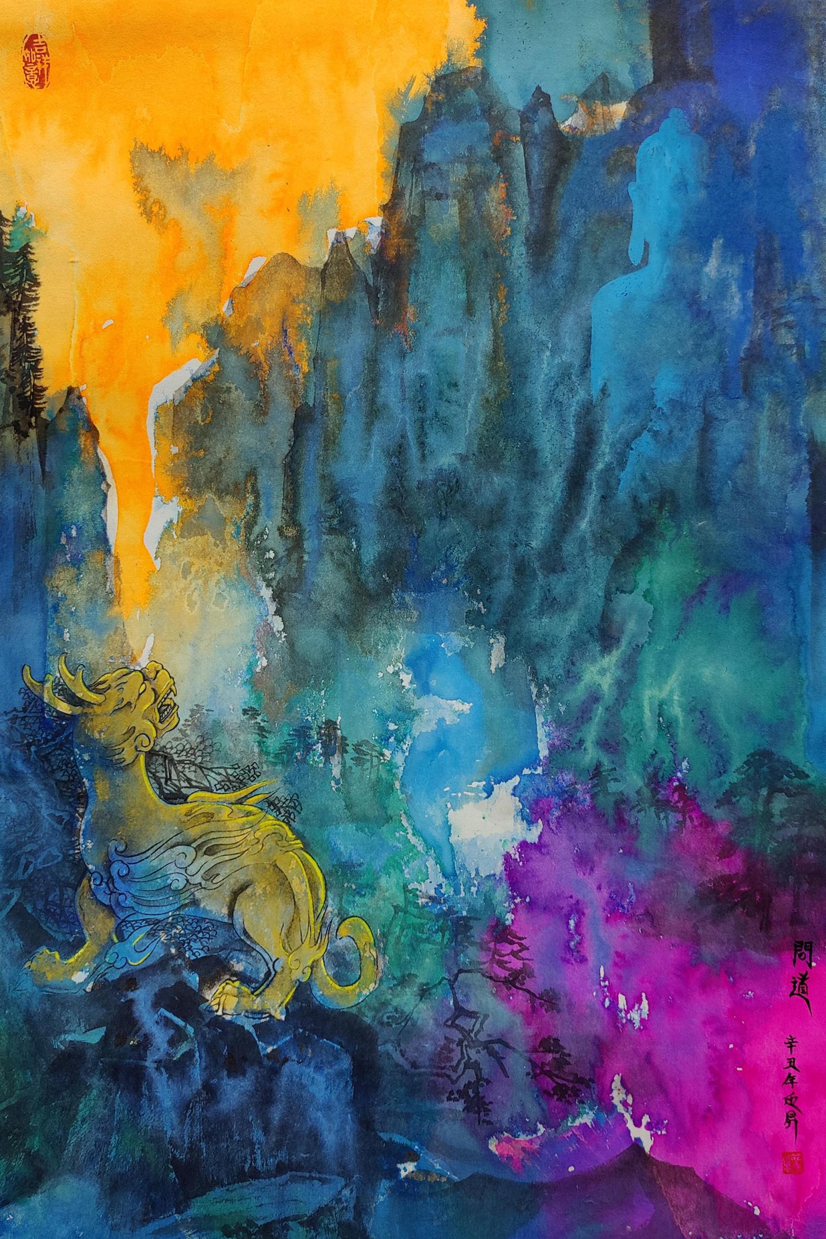 这是让中国国画大师石齐感到“耳目一新”的山水画——冷调、高饱和度的赛博朋克色彩,融入神秘的瑞兽等元素,展现出超现实的山水风景。日前,权迎升携新作亮相“问道穹宇”展览,这位始终在“探索自己的创造力边界”的艺术家,为观众带来了新的惊喜。
