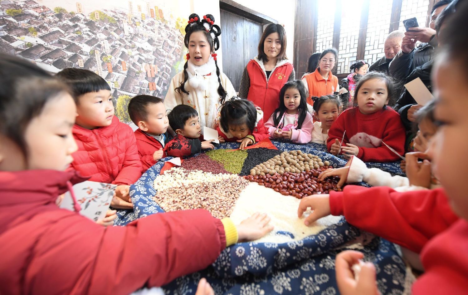 1月13日,浙江省湖州市实验幼儿园的老师带着学生在小西街的民俗展示厅认识腊八粥的原料。(图/新华社)