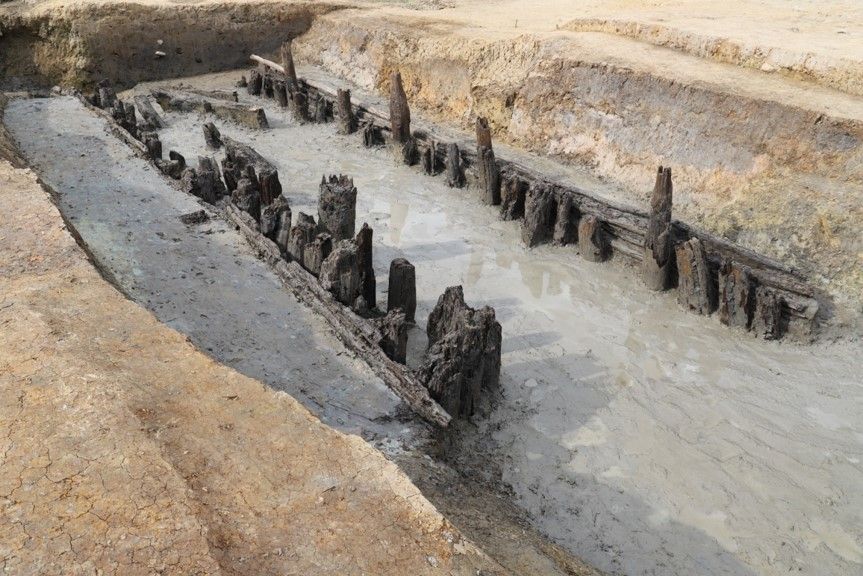 湖北郢城遗址东门发现木构桥梁遗存。(图/中新社)