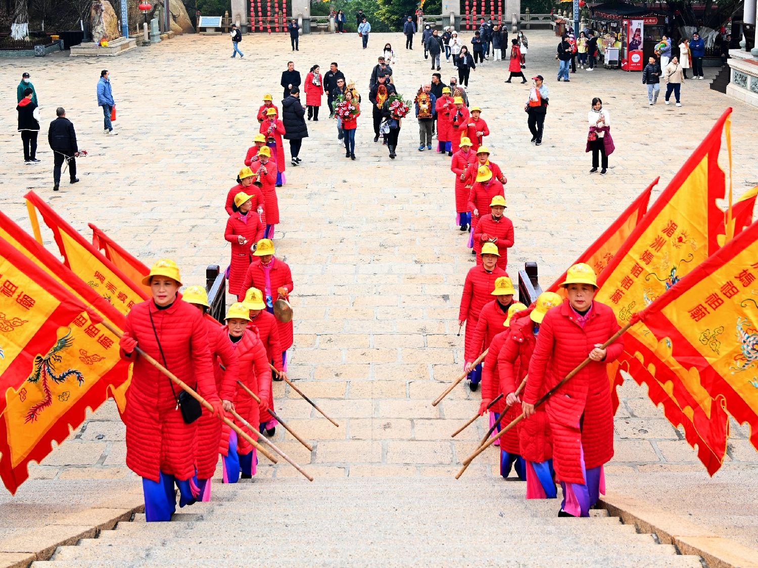 1月28日,台湾顶东石赞天宫等一行30余人组团恭请分灵妈祖赴莆田市湄洲岛湄洲妈祖祖庙谒祖进香。(图/中新社)