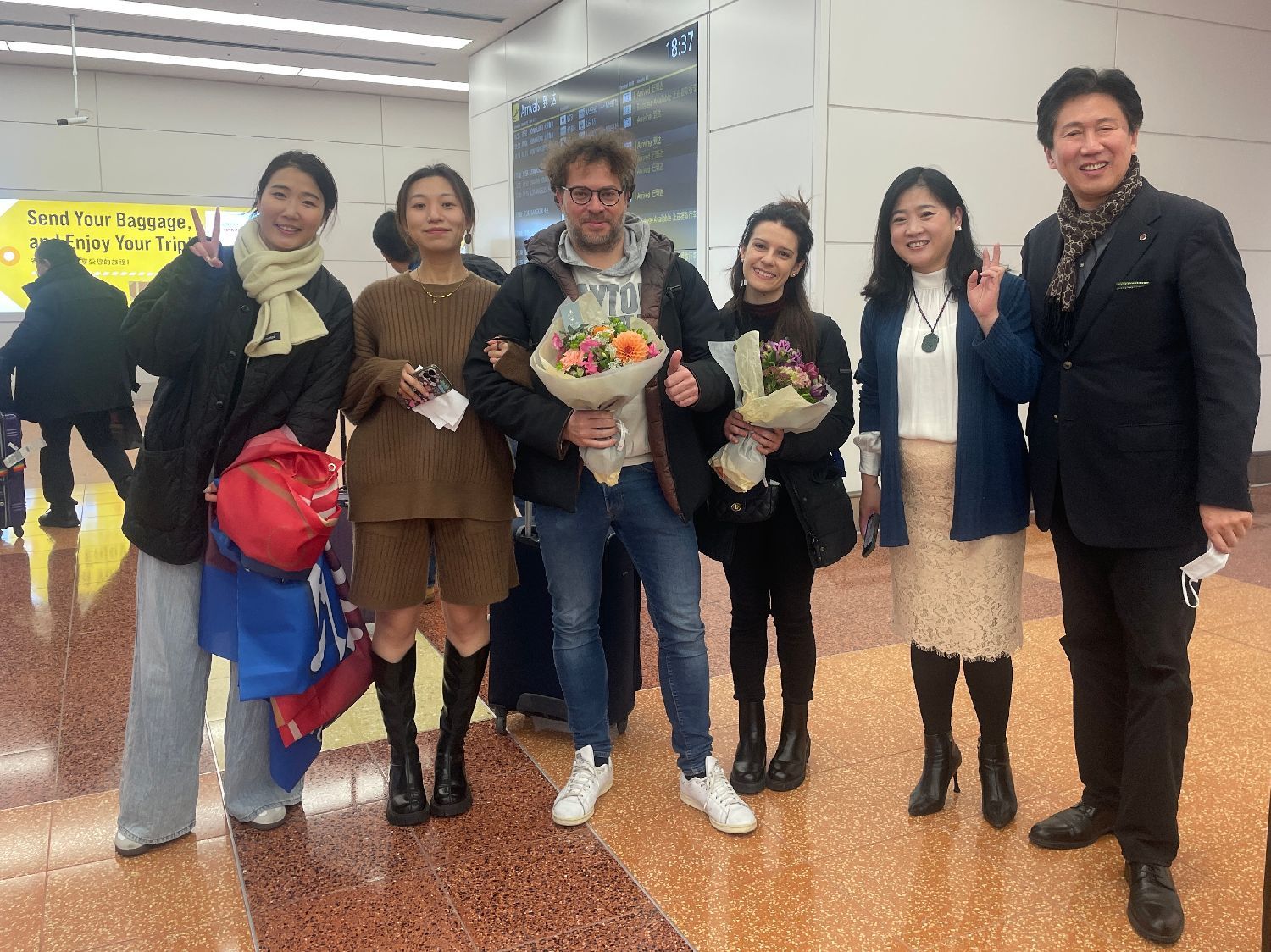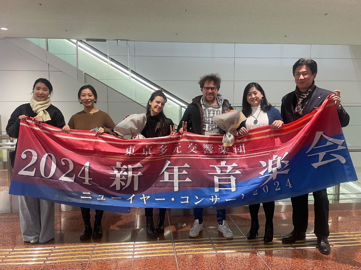 当天下午6点左右,交响乐团的负责人和工作人员早早守候在羽田机场的国际到达出口。两位艺术家一出现,他们就送上鲜花,并热情地与艺术家们问候、拥抱。乐团的工作人员们还拿出了准备好的欢迎横幅,大家一起合影留念。