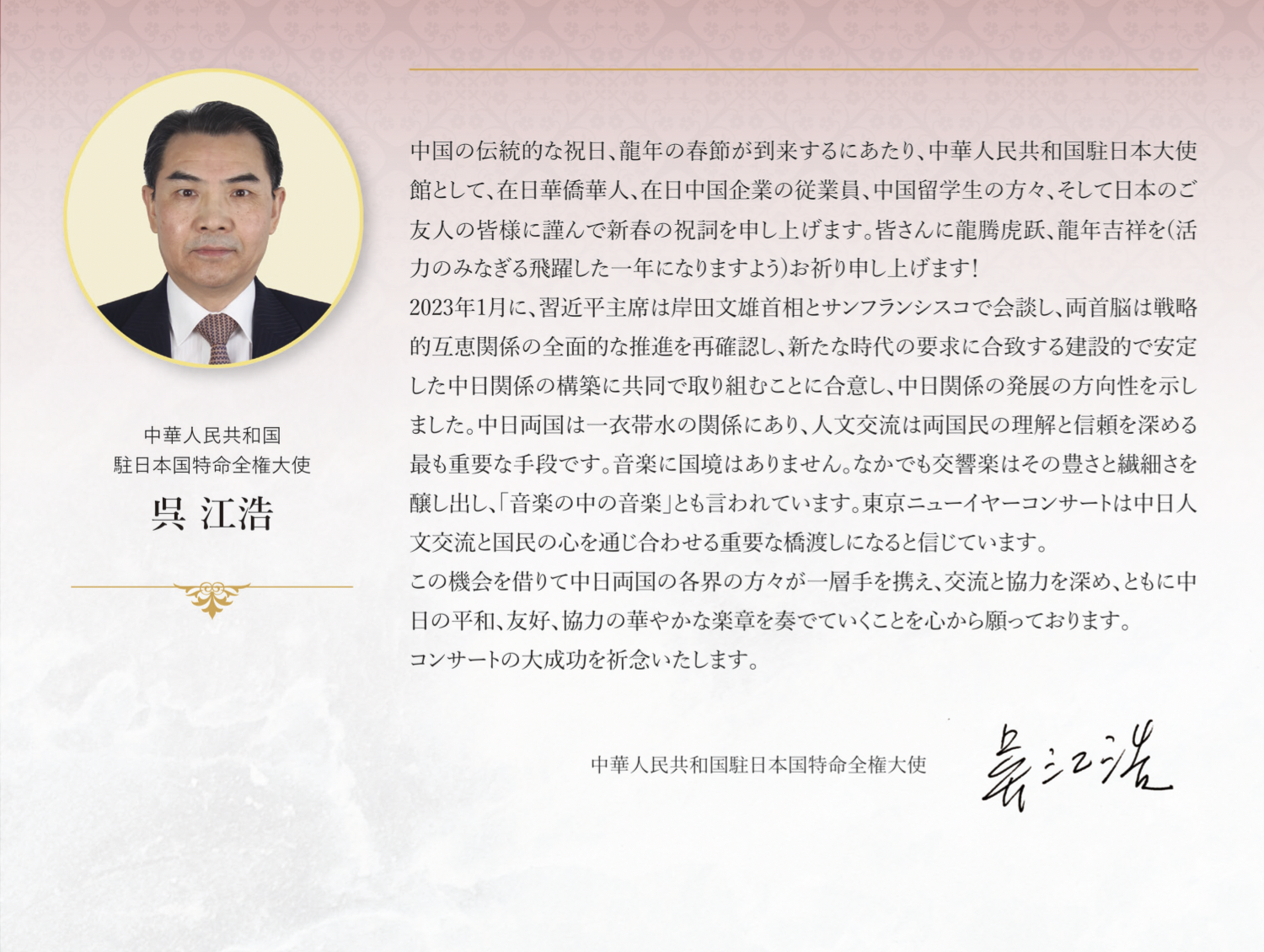 东京多元交响乐团第三回新年音乐会将于2024年2月4日ミューザ川崎シンフォニーホール隆重举行。中华人民共和国驻日本国特命全权大使吴江浩向2024年东京新年音乐会发来贺词。