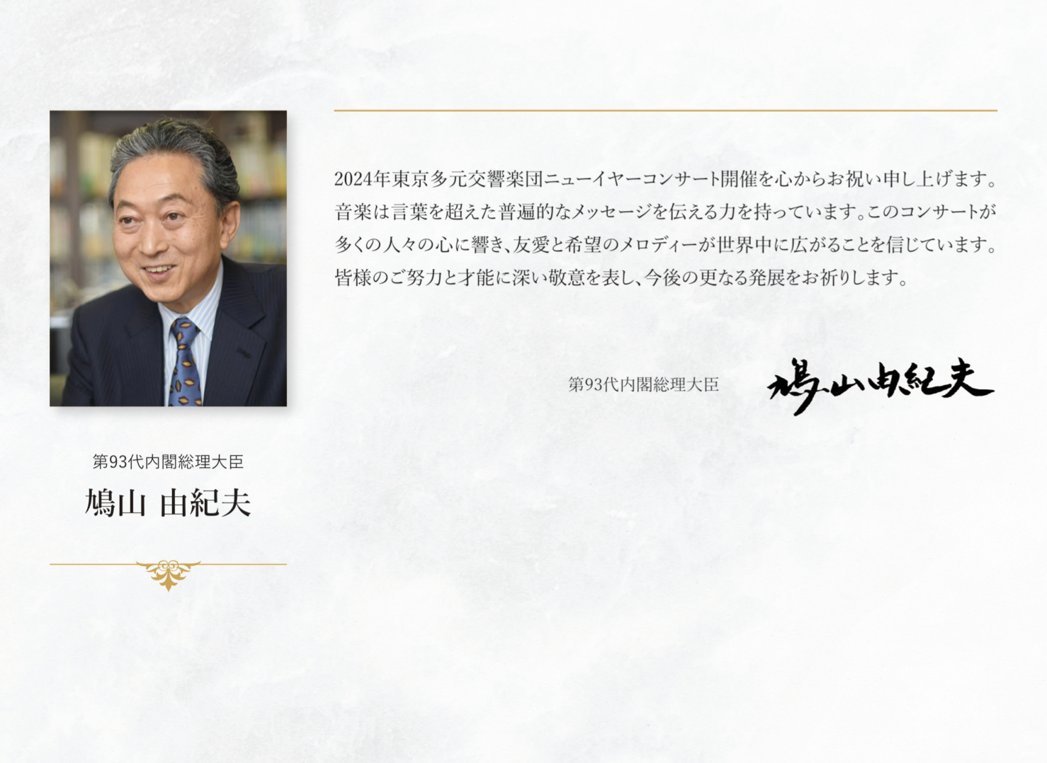 鸠山由纪夫前内阁总理大臣也向本次新年音乐会发来了贺词。鸠山由纪夫在贺词中表示,音乐具有超越语言传达信息的力量,这个音乐会在很多人的心中回响,也将友爱和希望的旋律传遍全世界。他对乐团的努力和付出表示深深的敬意,并希望今后有更大的发展。