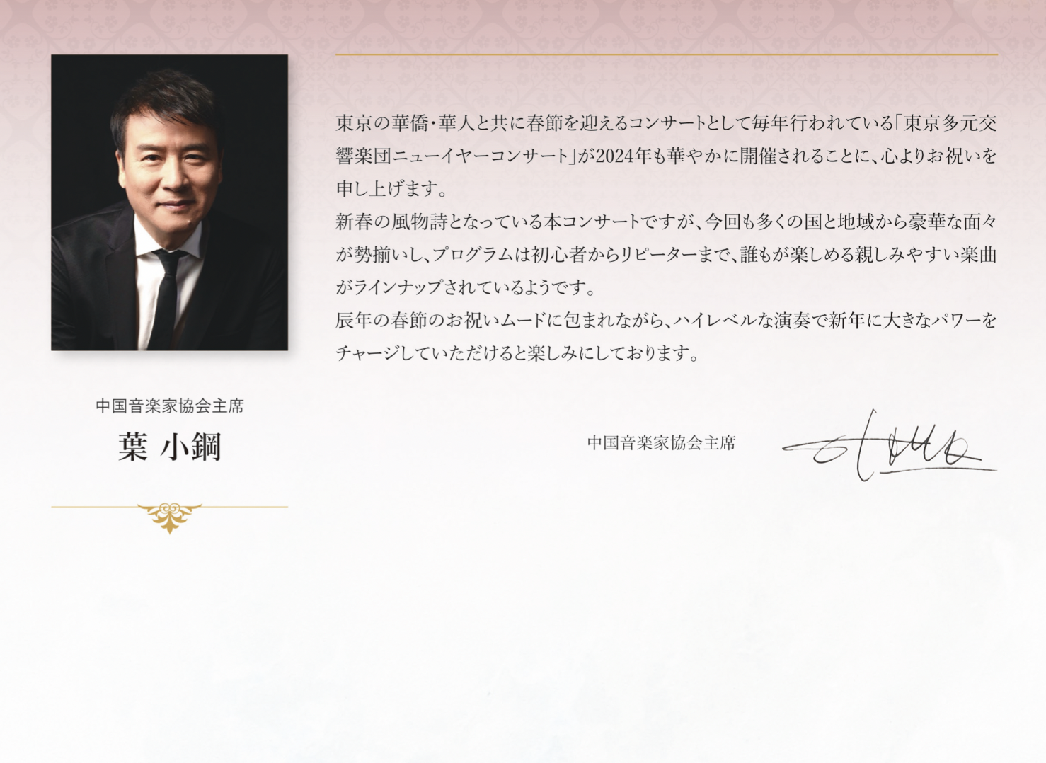 中国音乐家协会主席叶小钢在贺词中表示,东京多元交响乐团新春音乐会已经成为新春的一道亮丽风景,这次也有来自世界各地多个国家和地区的豪华阵容,不论是专业的还是普通的听众,都能够尽情享受亲切动听的乐曲。
