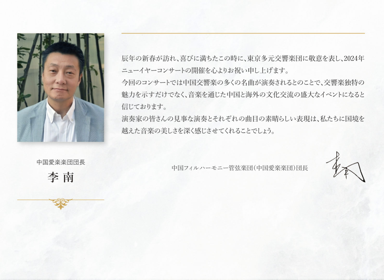 中国爱乐乐团团长李南在贺词中表示,此次音乐会将奏出中国交响乐团的多首经典曲目,不仅展现了交响乐团的独特魅力,还通过音乐展示了中国与海外在文化交流上的盛会。期待各位演奏家的精彩演奏和各自曲目的精彩表现!