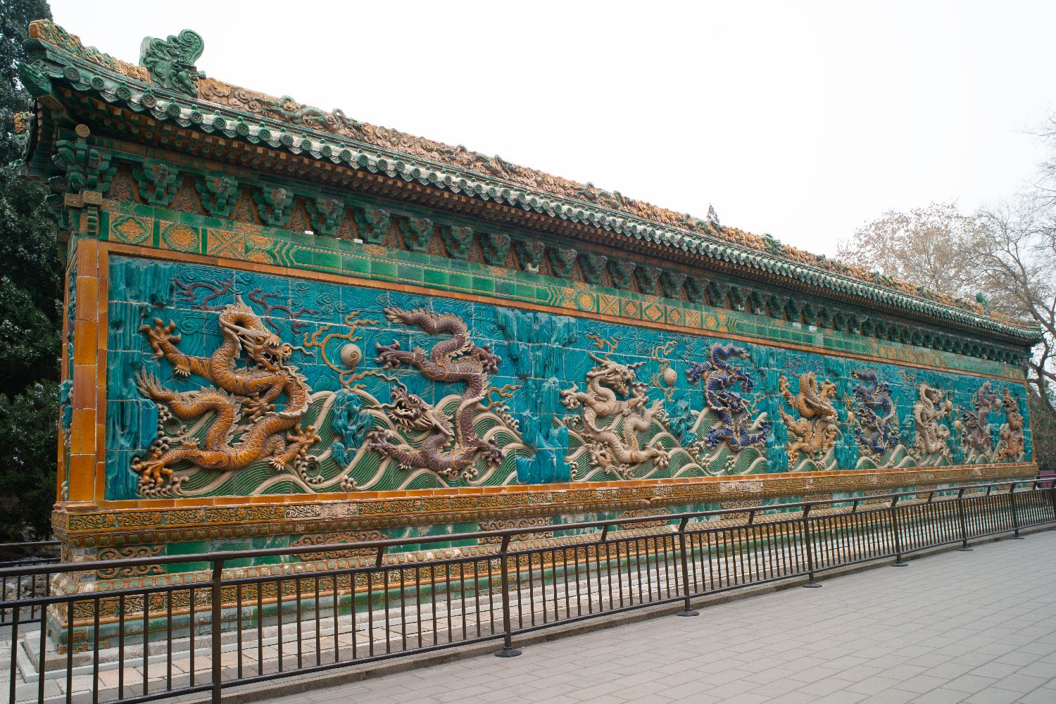 由北海公园北门进入,一路向西,长约26米、高约6米、宽约1.5米的九龙壁映入眼帘,龙姿各异,飞腾戏珠于波涛云际之间。张冕表示,九龙壁是影壁的一种。北海公园九龙壁原是大圆镜智宝殿山门前的影壁,与故宫九龙壁、大同九龙壁合称为“中国三大九龙壁”。