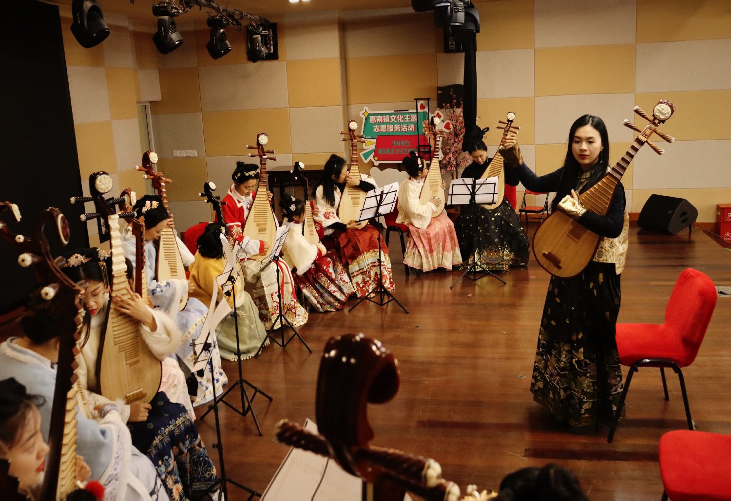 舞台上,十数名琵琶爱好者身着汉服,髻簪绒花,怀抱琵琶。舞台前,“90后”沪漂姑娘王睿琳手持曲谱,细细讲解曲目技法。轻拢慢捻抹复挑,“叮咚”声次第渐起,一曲《新年好》萦绕在教室中。