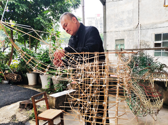 近日,黎达正在扎生肖龙灯的龙头骨架。“一条约7米的龙灯需要分段完成,分别制作各个部位的骨架,再组合在一起。”黎达说,要选用柔韧度较好的竹子,将其削制成3毫米至4毫米宽、不同长度的竹篾,而后根据花灯造型,以交叉方式编织完成骨架。