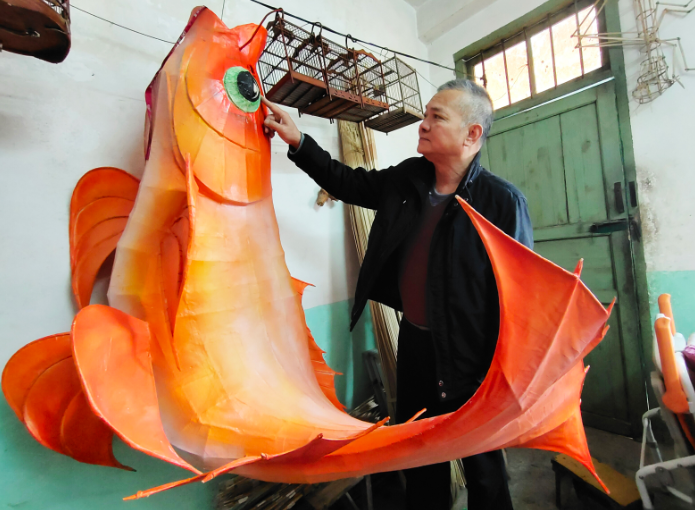 近日,在广西南宁市江南区菠萝岭社区,花灯艺人黎达在展示其制作的锦鲤花灯。(图/中新社)