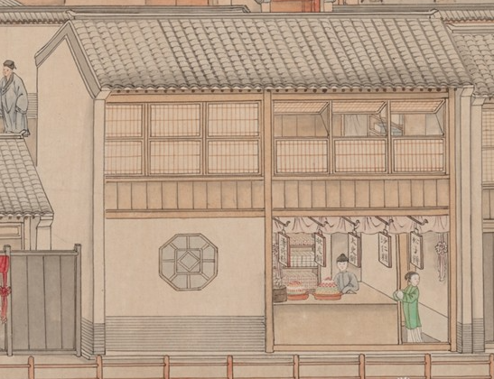 《乾隆南巡图》第六卷局部,茶食店及“薄荷糕”“状元饼”“太史饼”“沙仁糕”“松子饼”招牌。(图/北京《中国青年报》)