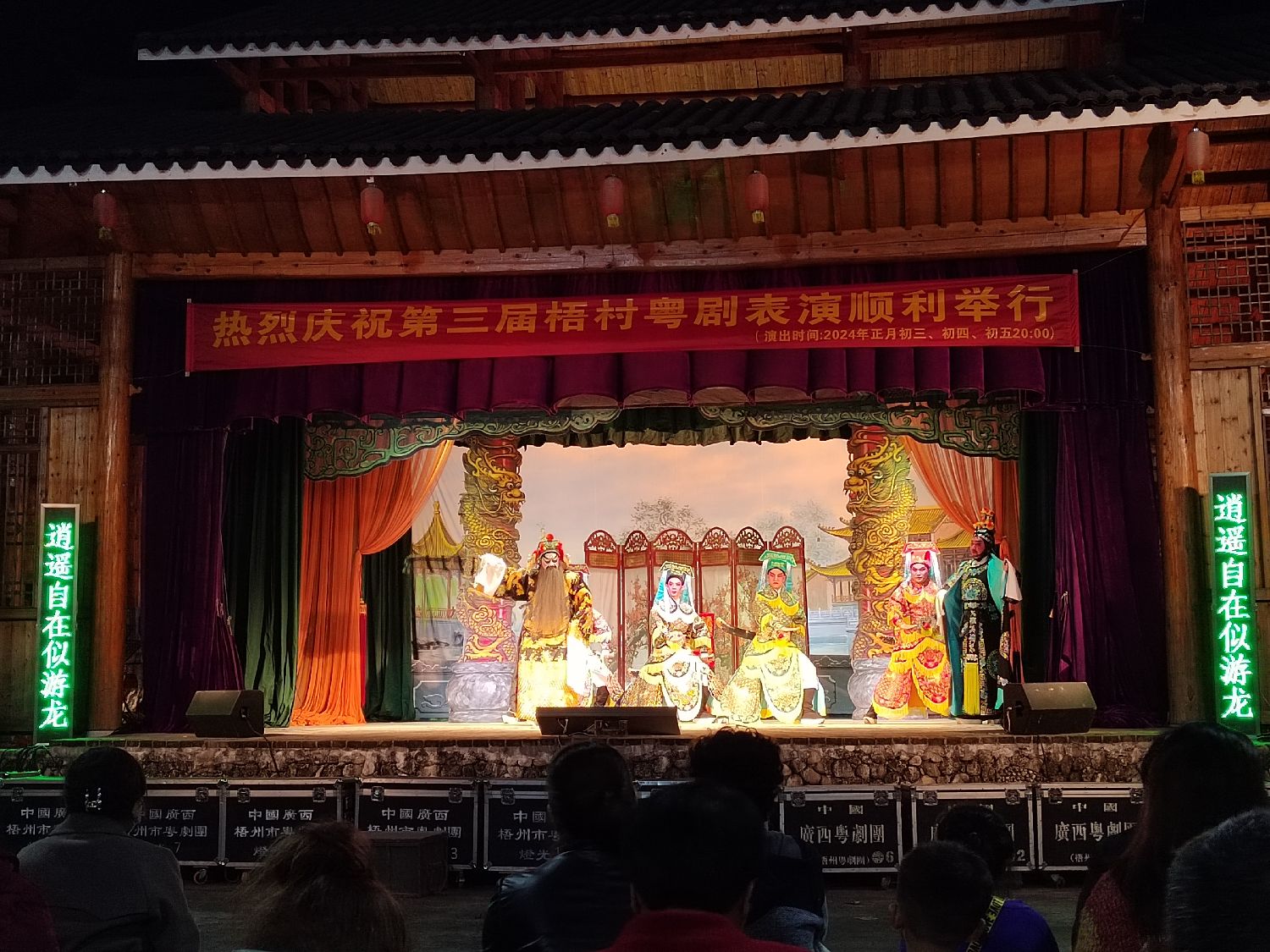 2月12日,农历正月初三,广西梧州粤剧团“春班”下乡,走进玉林北流市梧村,为当地民众送上新春祝福,开台首演经典粤剧《女巡按审婚》。