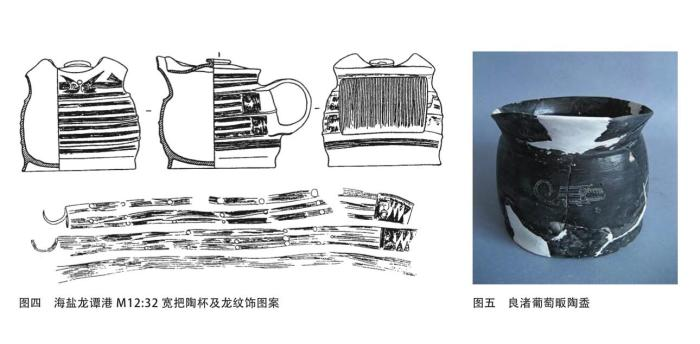 良渚陶器龙图案已发现多例,有的仅存龙首局部,有的仅存龙尾局部,有的仅存龙身躯局部,完整的目前只发现两例:一是海盐龙潭港M12号墓出土的宽把陶杯,在宽把陶杯腹部一周施刻上下并列的两条龙图案,头部特征突出,尖牙利齿,双目圆睁;二是余杭良渚遗址群内葡萄畈遗址出土的陶盉,在陶盉腹部施刻一条龙图案,其龙身躯特征弱化,突出表现尖牙利齿、双目圆睁的龙头特征和细尖内卷的龙尾特征,且与龙潭港M12号墓宽把陶杯腹部龙图案的首部和尾部特征基本相同,而龙首特征更为醒目。此外,在良渚遗址群发现的一例施刻在陶片上的龙图案,缺失龙头,龙身躯和尾部大致完整,龙身躯呈盘卷状,是为蟠龙。