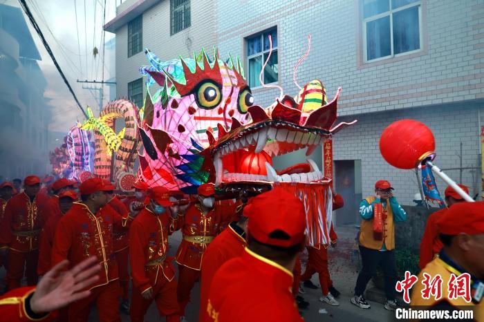 图为2月14日,漳平市新桥镇西埔村村民舞起长约300米的板凳花灯龙穿村祈福。 郭亦斌摄