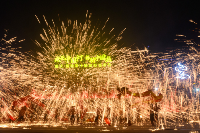 北京时间22日晚的重庆铜梁寒风阵阵,21岁的李宜桓却赤膊上舞台,高举20米长的巨龙在“火海”中舞动,迎接即将来临的龙年元宵佳节。辗转腾挪间,队友将超过1000℃的铁水拍向夜空,铁花散开,犹如夜放花千树,更似吹落星如雨。