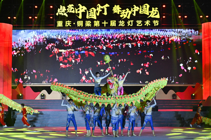 2月2日,重庆市铜梁区的竞技舞龙队在舞台上表演。(图/中新社)