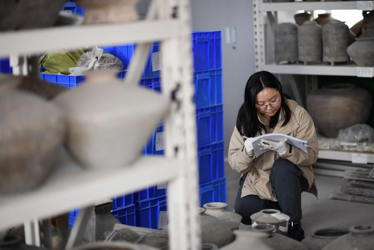 3月5日,陕西省考古研究院女子考古队队员张佳杨在库房对文物进行登记造册。(图/新华社)