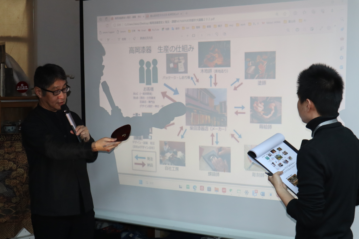 3月9日,日本传统工艺高冈漆器协同组合理事长柴田治之与现场观众分享高冈漆器的制作及文化。(图/楚一 摄)