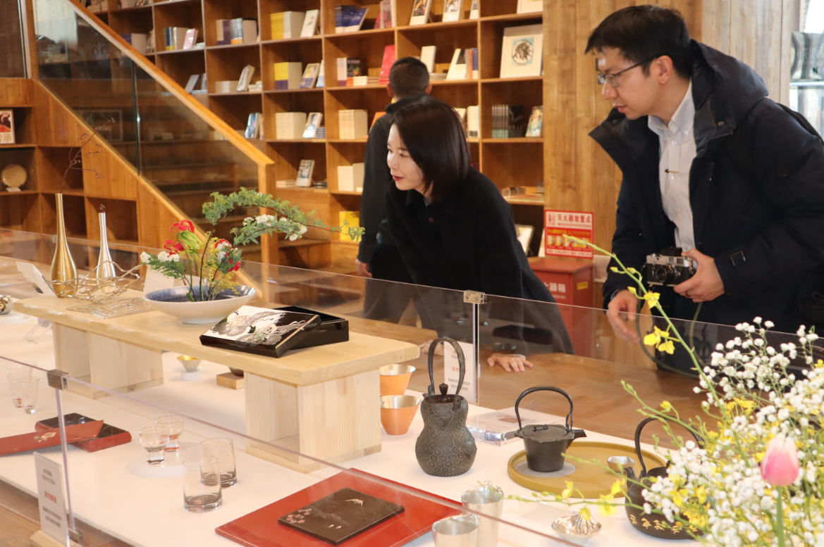 3月9日,活动现场,中国文物学会陶瓷组会员、瓷器修复艺术家王京向高冈漆器协同组合理事长柴田治之等人介绍店内文创产品。(图/楚一 摄)