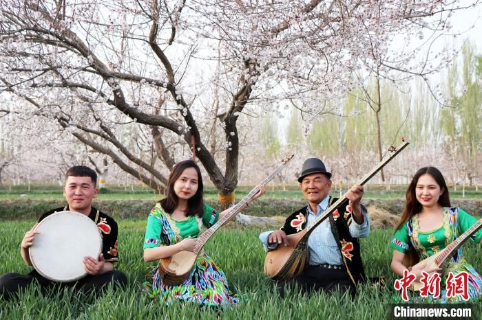 资料图:杏花环绕下,民间艺人喀迪尔·伊卜拉伊木(右二)娴熟地拨动琴弦。(图/中新网)