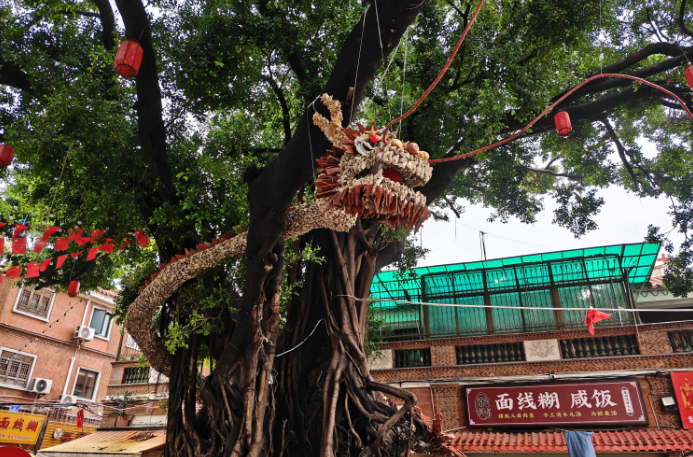 在福建泉州的古城街巷里闲逛,总有不期而遇的惊喜。走进泉州西街菜市场,抬眼望去,便能见到一株老榕上盘踞着一条由海蛎壳和红砖瓦构成的“红羽礁龙”。