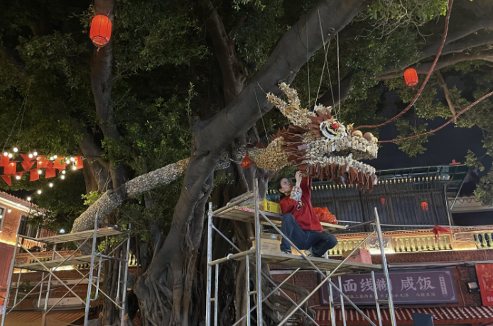 1月31日,宝小格在福建泉州西街的古榕上创作“红羽礁龙”。(图/中新社)