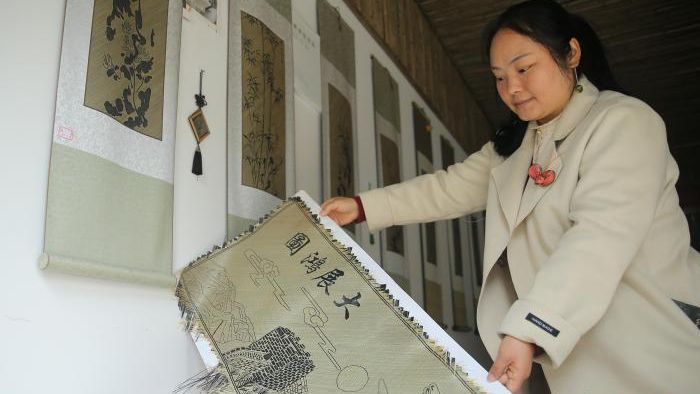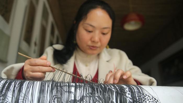 最近,袁朝秀正忙着编织名为“大展鸿图”的作品。她介绍,会使用到上万根竹丝,部分竹丝需要进行上色。
